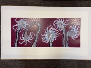 Night Flowers (A), Edition 113/120. Screenprint [23 screens, 24 colors, 24 runs]. Image: 28 x 66.3 cm. Sheet: 42.8 x 80 cm. Published in 2003 on Kakita-shi paper by Okabe Tokuzo. A print of the same edition is represented in plate 314, page 182 of the Catalogue Raisonné of Kusama's prints: Yayoi Kusama Prints 1979-2017 published in 2017 by ABE Books. "Night Flowers (A)" by Yayoi Kusama is a vibrant, immersive art installation featuring her signature polka-dot patterns and organic, flower-like forms. The work reflects Kusama's fascination with infinity, repetition, and the interplay of light and color, creating a dreamlike experience for viewers.